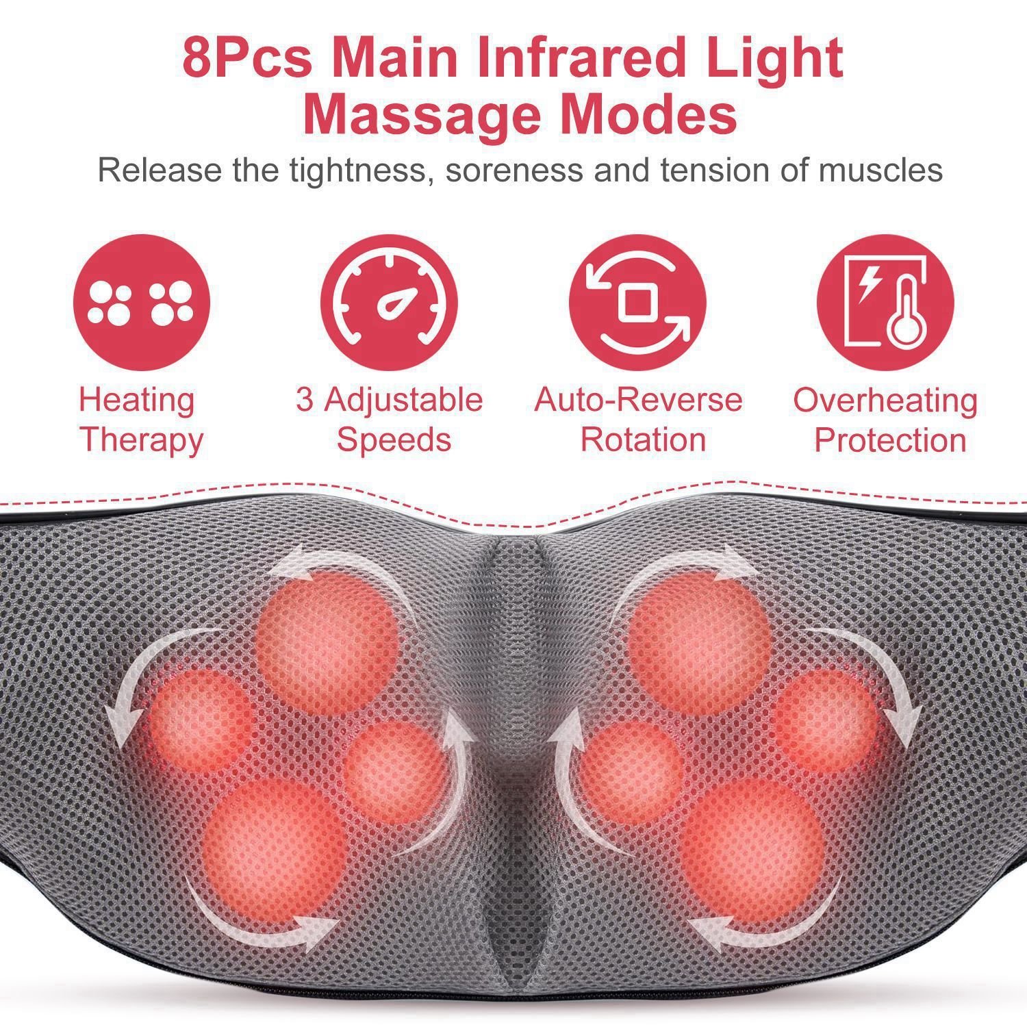 *Heat Function & 3 Speeds*:8Pcs Main massage nodes are designed with heating infrared light,bring warmth to your muscles and result in speeding up blood circulation. 3 Adjustable speeds from slow to fast provide multiple options to fit for various people demands,like teenager,adults,seniors and pregnant woman.