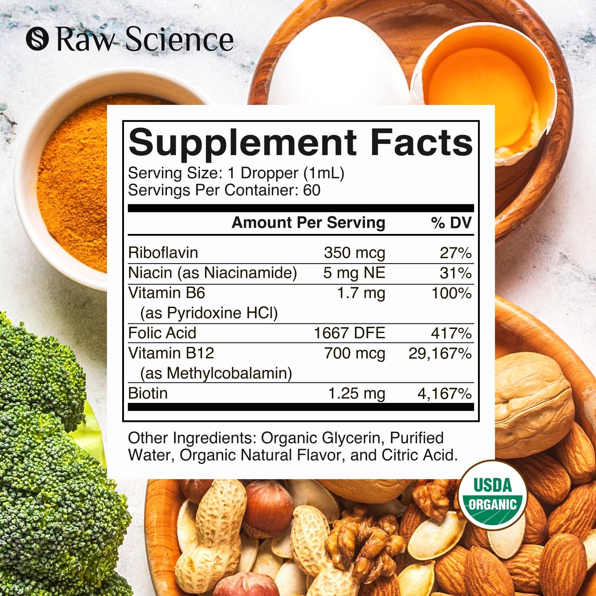 1.complete b vitamins complex for women & men: raw science b complex drops contain all the essential b complex vitamins for women and men to support your health and kickstart your body into wellness. it's a dose of energy supplement you can feel! vegan b complex: this enhanced vit b complex contains b3, biotin and b12 vitamins for men and women. also complex b vitamins contain 1700 mcg of folate supplement for women (folic acid 1000 mcg), almost riboflavin 400 mg and vitamin b6 for