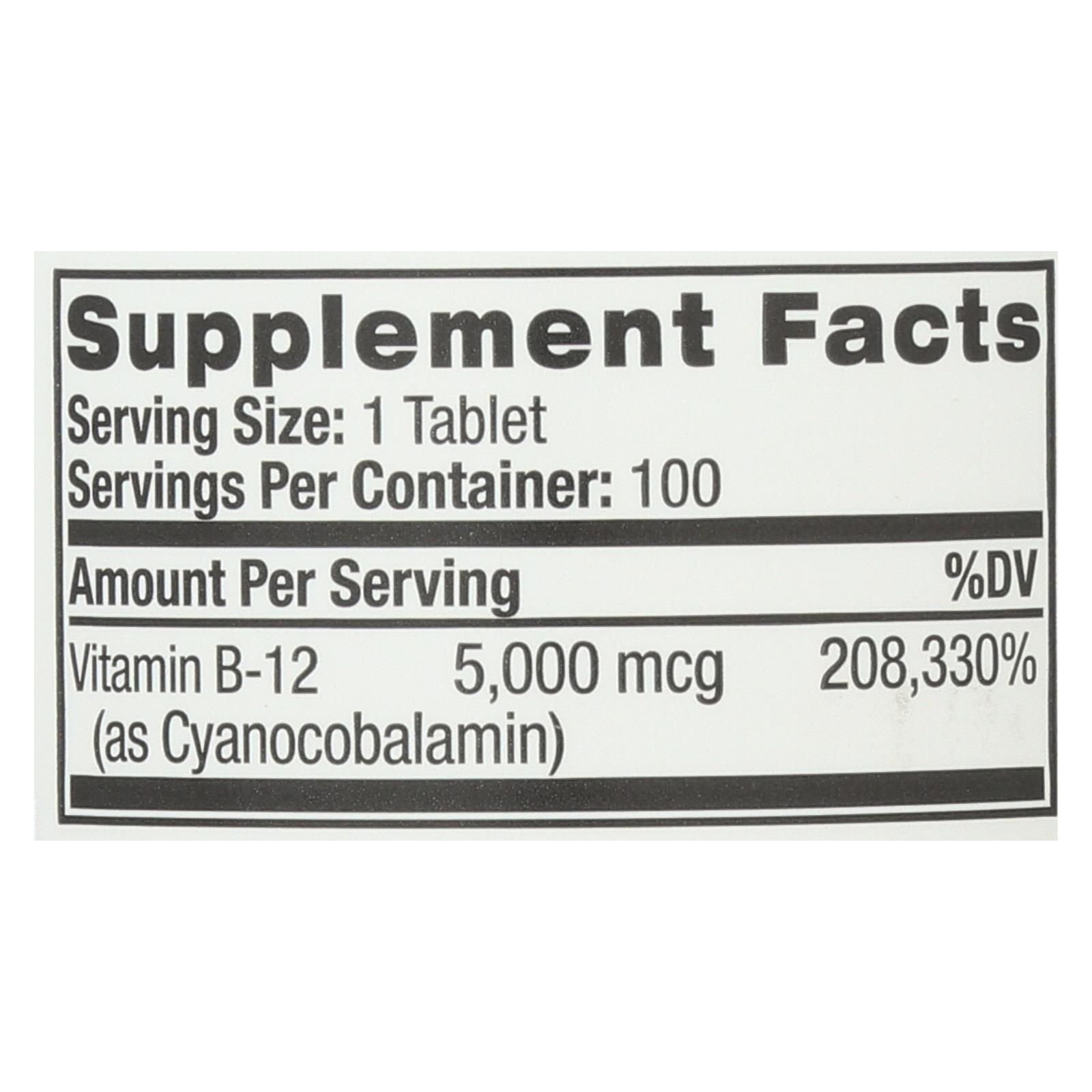 Natrol vitamin b-12 dietary supplement in strawberry contains 5000 mcg. Of vitamin b-12 as cyanocobalamin per tablet to promote energy and support a healthy nervous system. These fast-dissolve tablets don't require water, making them convenient and easy to take anytime and anywhere. Each bottle of vitamin b-12 contains 100 vegetarian tablets that do not contain artificial colors, flavors or preservatives.