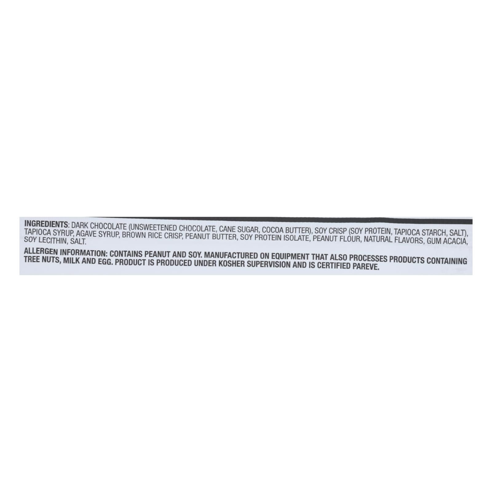 ingredients : dark chocolate;unsweetened chocolate;cane sugar;cocoa butter;soy crisp;soy protein;tapioca starch;salt;tapioca syrup;agave syrup;brown rice crisp;peanut butter;soy protein isolate;peanut flour;natural flavors;gum acacia;soy lecithin