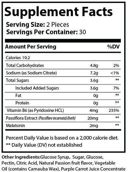 Pure Sleep gummies helps you get to sleep and get quality sleep so you can recharge and recover properly. We put the standard melatonin. We also added vitamin B6 to help produce more melatonin naturally. Melatonin tells the body that it is night time and prepares it for sleep. This is helpful when you have long or busy days and need the signals earlier than you plan on sleeping for better recovery. Our sleep formula also includes passion flower to help relax the body and mind to bring it closer to sedentary.