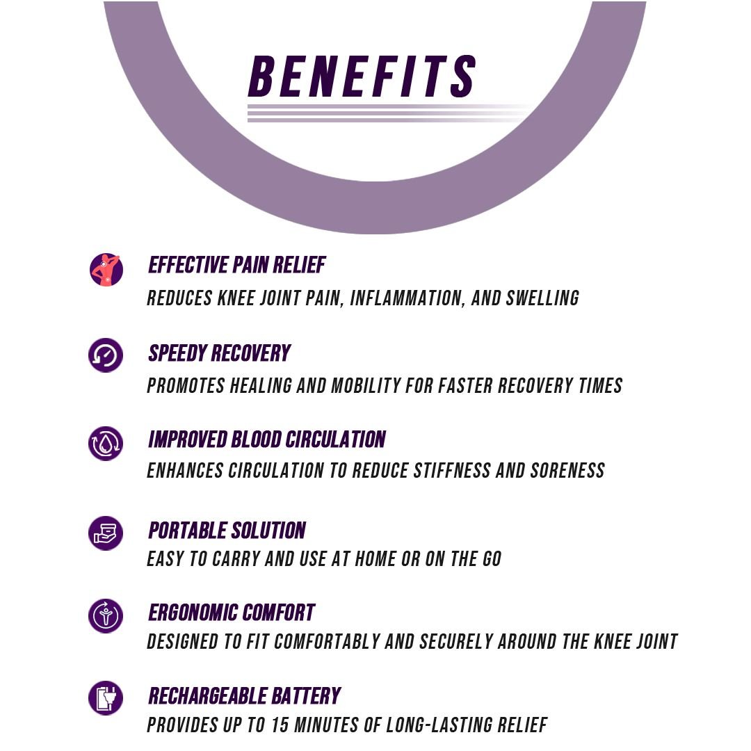 <p><b>Effective: </b>Relieves knee joint pain and stiffness, reducing inflammation and swelling; promotes injury recovery helping speed up recovery and mobility; and improves blood circulation with built-in hot compress and vibration massage.</p>