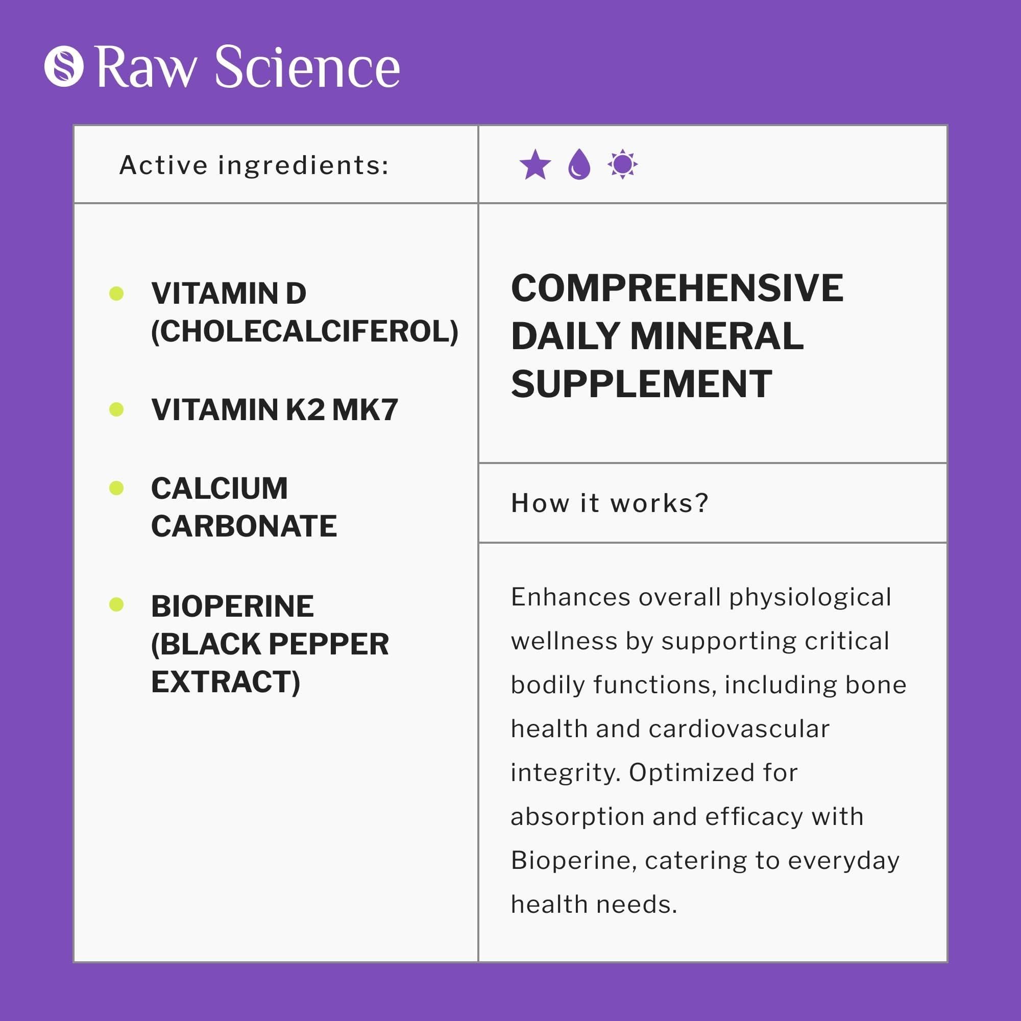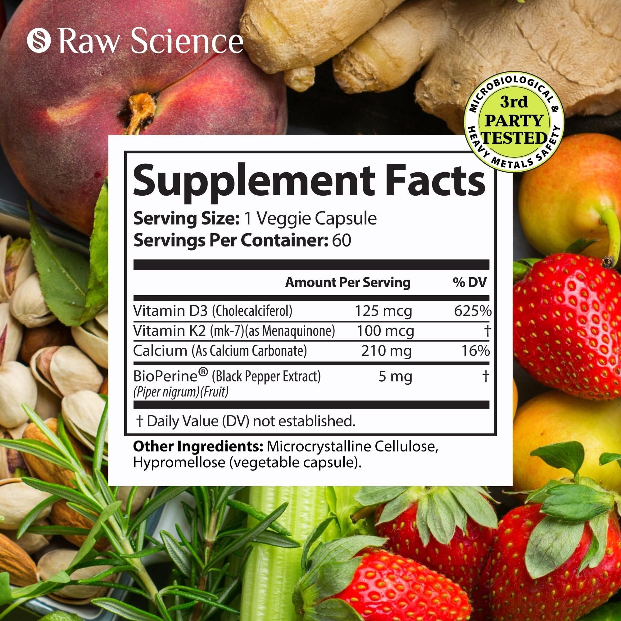 1.bone and heart health fortify your wellness regime with our d3 k2 vitamin 5000 iu supplement. this formula integrates k2 d3 vitamin supplement with calcium for men & women, ensuring that your daily capsule intake meets the highest quality and efficacy standards. calcium supplements for women & men our formula includes calcium carbonate that is perfect for your bones and teeth. these d3 and k2 supplements are made in the usa and feature bioperine that promotes calcium and vitamin d